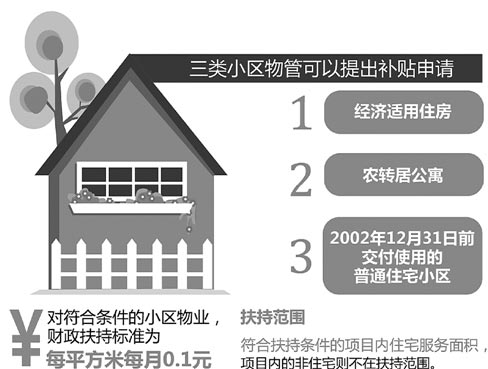 根据《办法》,对符合条件的小区物业,财政扶持标准为每平方米每月0.1元。扶持范围是符合扶持条件的项目内住宅服务面积,项目内的非住宅则不在扶持范围。扶持资金列入市、区两级财政年度预算,按1:1的比例分别承担。