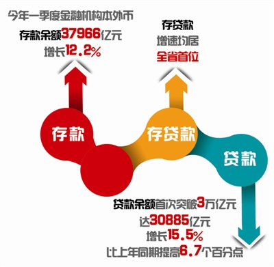 这从杭州市统计局刚刚发布的一组数据也能窥见一斑:今年一季度金融机构本外币存款余额37966亿元、增长12.2%;贷款余额首次突破3万亿,达30885亿元、增长15.5%,比上年同期提高6.7个百分点;存贷款增速均居全省首位。