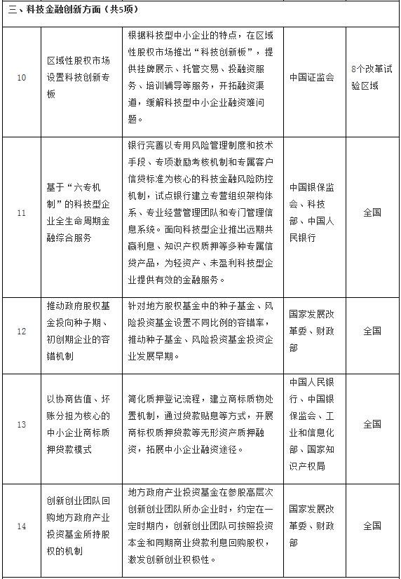 (三)科技金融创新方面5项:区域性股权市场设置科技创新专板;基于“六专机制”的科技型企业全生命周期金融综合服务;推动政府股权基金投向种子期、初创期企业的容错机制;以协商估值、坏账分担为核心的中小企业商标质押贷款模式;创新创业团队回购地方政府产业投资基金所持股权的机制。