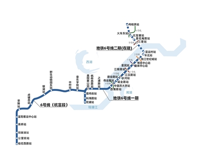 地铁6号线二期工程起于萧山区丰北站(不含),止于上城区枸桔弄站,线路长8.4公里,共设车站6座,目前各车站正在进行附属结构土建,以及机电安装和装修施工,计划今年建成。